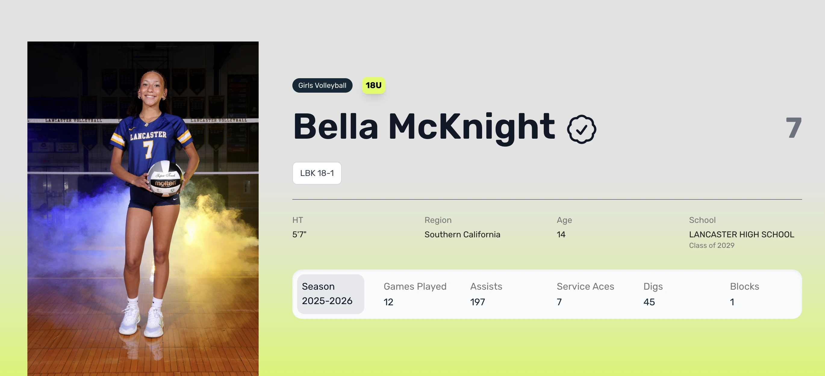 Bella McNnight, 14 year old setter, is an elite prospect leaving her mark on the Nike Circuit. McKnight is no stranger to competition. She started her year by making the Lancaster High School Varsity squad and recording 550 assists in her debut season. She has continued her phenomenal season by setting for LBK 18-1 Team, where she has excelled among top Midwest Competition: